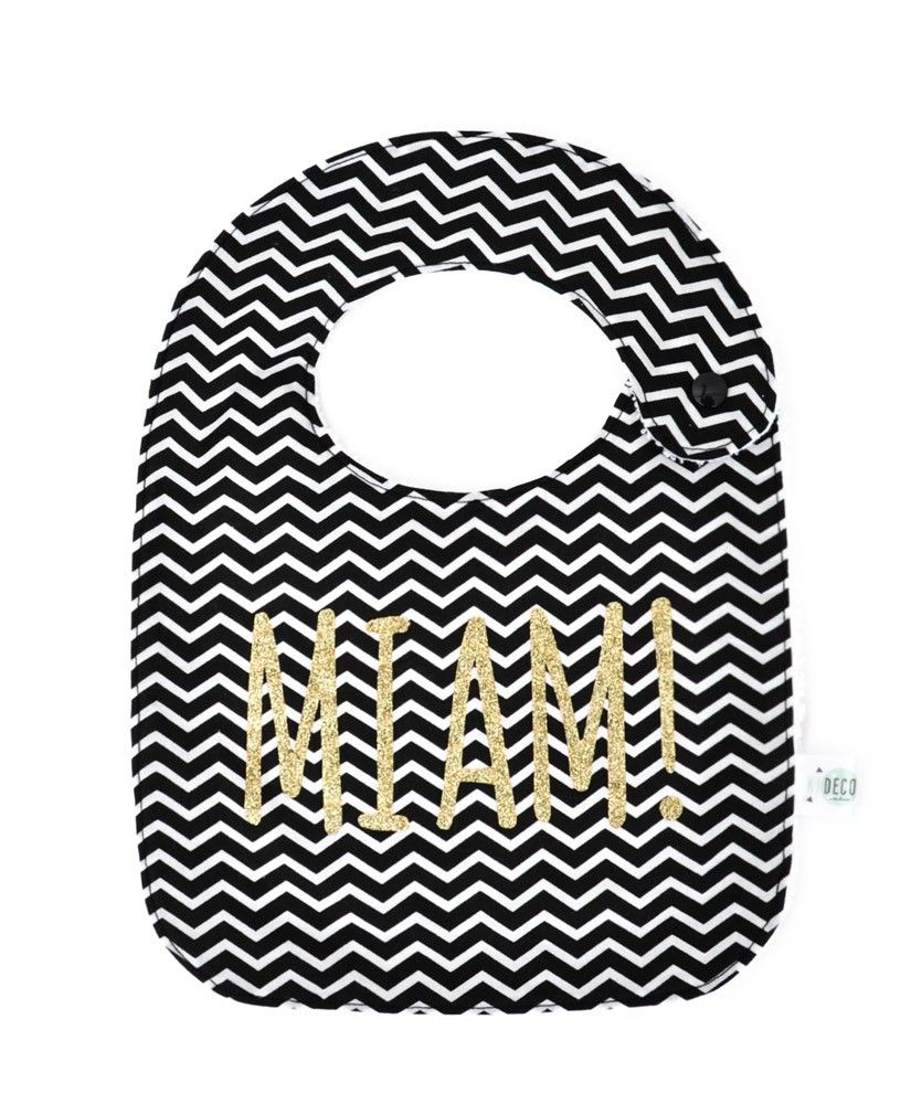 Bavoir MIAM ! à chevrons noirs et blancs.